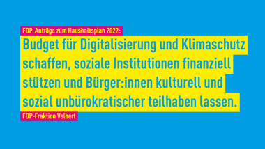 Die FDP-Fraktion Velbert bringt für den Haushaltsplan 2022 der Stadt Velbert einige Initiativen für die Digitalisierung, für den Klimaschutz und für Soziales in den Rat ein.