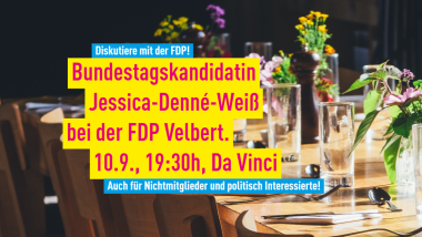 Am 10.9. findet nach pandemiebedingter Pause endlich wieder der Stammtisch der FDP Velbert statt. Mit dabei ist auch die Bundestagskandidatin für den Velbert Wahlkreis Jessica Denné-Weiß.